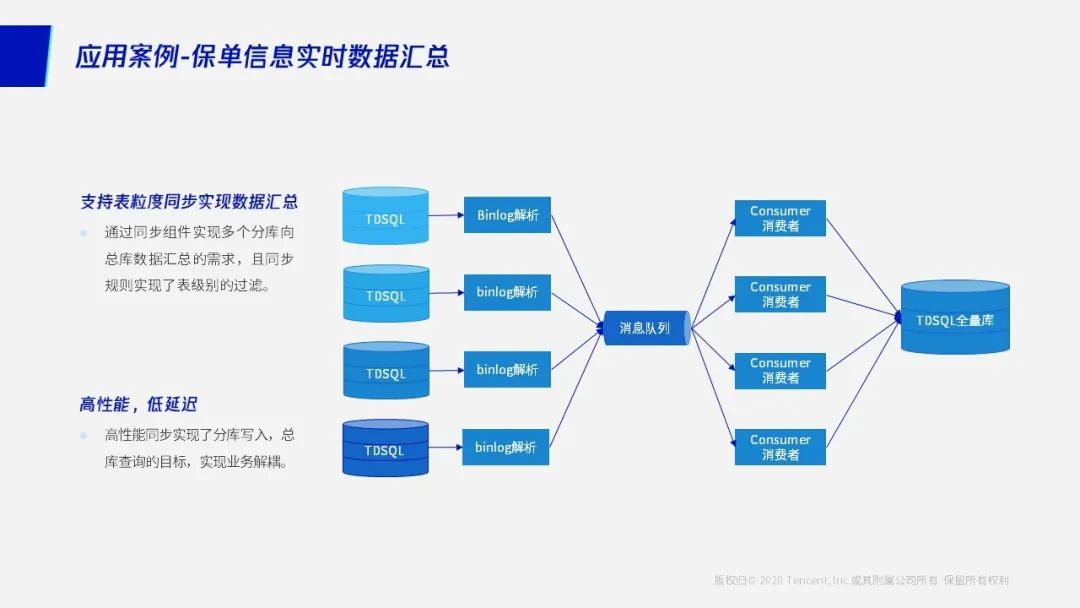 以某大型互联网保险公司为例,基于TDSQL多源同步迁移方案,实现了多对一的一拓扑结构,可以非常高效、稳健地将公司多套大区的业务数据汇总到一个全量库里面,继而实现了对整体数据进行报表分析和抽取。