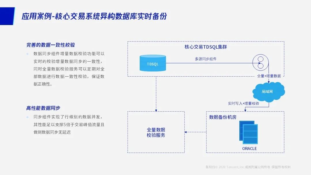 在张家港行数据库迁移实践中,核心交易集群是TDSQL,TDSQL多源同步方案通过内部的局域网,将存量和增量数据,写入到备份机房,同时也通过全量的数据校验服务保证数据源、目标是完全一致来进行风险控制。当核心交易系统如果出现一些小概率不可恢复的灾难时候,系统可以在短时间内将交易的服务全部切换到备份机房的Oracle上,作为银行传统核心系统数据库迁移的安全兜底方案,最后确保数据库顺利迁移。