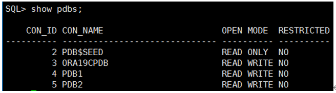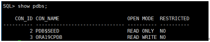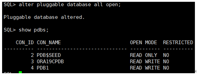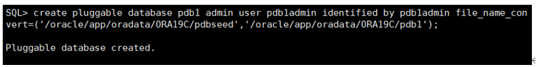 create pluggable database pdb1 admin user pdb1admin identified by pdb1admin file_name_convert=('/oracle/app/oradata/ORA19C/pdbseed','/oracle/app/oradata/ORA19C/pdb1');