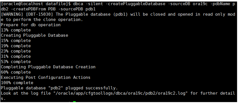 dbca -silent -createPluggableDatabase -sourceDB ora19c -pdbName pdb2 -createPDBFrom PDB -sourcePDB pdb1
