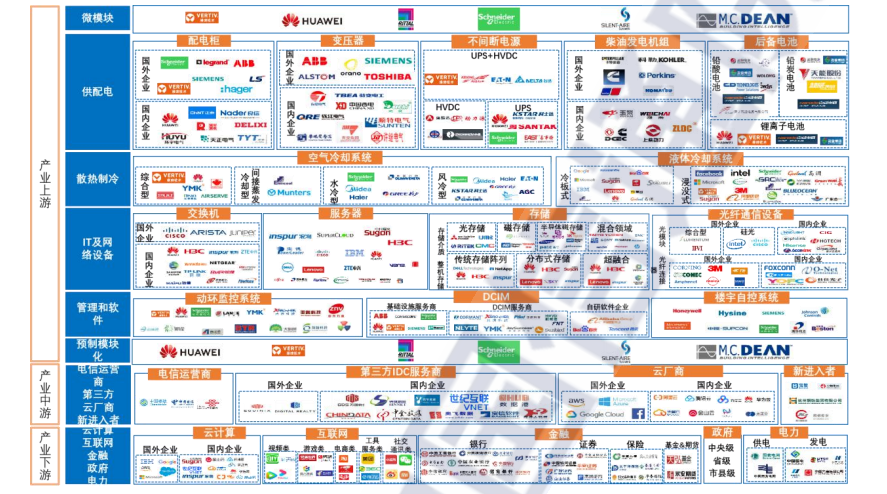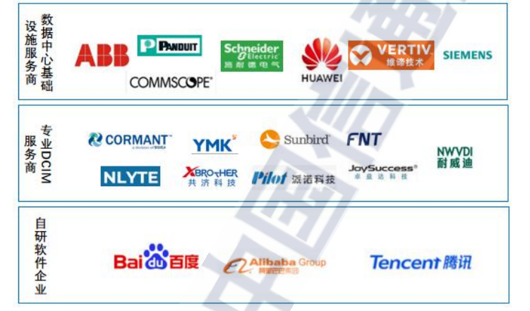 产业上游主要是为数据中心建设提供所必须的基础设施或条件,其中设备商提供基础设施和 ICT 设备,分别为底层基础设施(供配电系统、散热制冷系统等)和 IT 及网络设备(交换机、服务器、存储),而软件服务商提供数据中心管理系统(动环监控系统、数据中心基础设施管理系统等)。