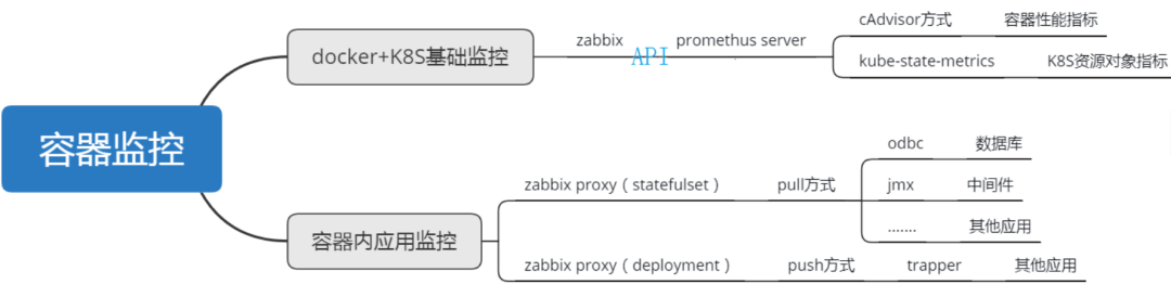 对于容器内中间件和数据库的监控,zabbix自身的Database、jmx监控方式或应用主动推送数据不需要安装agent,实现方便,容器内应用仅需与同k8s集群的容器内zabbix proxy能实现互相访问即可,监控项可以复用容器外应用模板,所以仍采用zabbix监控容器内应用实现方案。
