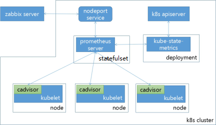 由于 prometheus对docker和 k8s 监控的天然集成,通过 cAdvisor 可以直接获取 docker基础监控数据, 通过 kube-state-metrics可以直接获取K8S的资源对象和对应监控数据 ,因此我们在每个K8S集群上默认部署prometheus 实现这部分监控采集, 然后通过Zabbix Http Agent 方式调用prometheus API来获取数据,接入Zabbix Server从而复用之前建设的功能 ,实现后续的告警阈值配置和数据接入集中监控平台。