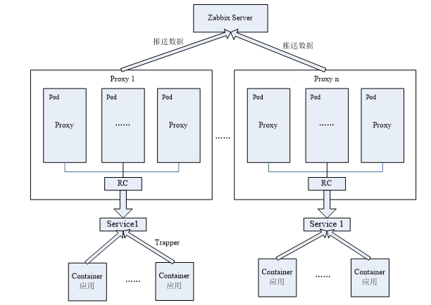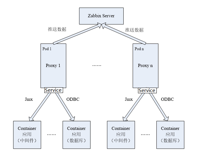 Pull采集方式 为Zabbix Proxy主动采集数据,Proxy从Server获取到配置信息后与得到的IP和端口进行通信得到监控项的值,获取数据后再返回给Server;Push采集方式 为应用主动推送数据给Zabbix Proxy,应用容器需要向指定的Proxy 的 IP地址,Proxy得到数据后再推送给Server,由于容器本身并不会有固定的IP地址,拟使用service替Proxy向外提供固定的IP和端口。