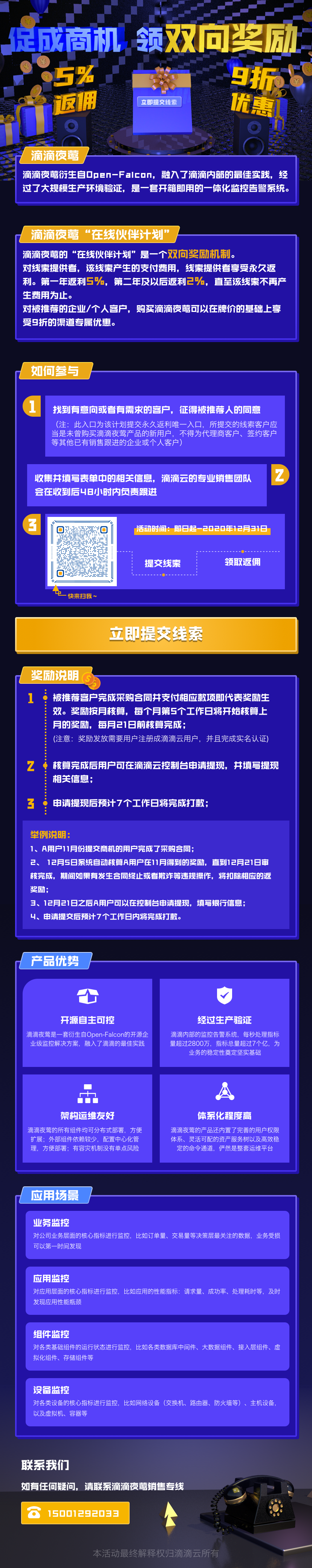 桔妹导读:滴滴夜莺衍生自Open-Falcon,融入了滴滴内部的最佳时间,经过了大规模生产环境验证,是一套开箱即用的一体化监控告警系统。现在又推出了「在线伙伴计划」,可领取双向奖励,一起来了解详情吧!