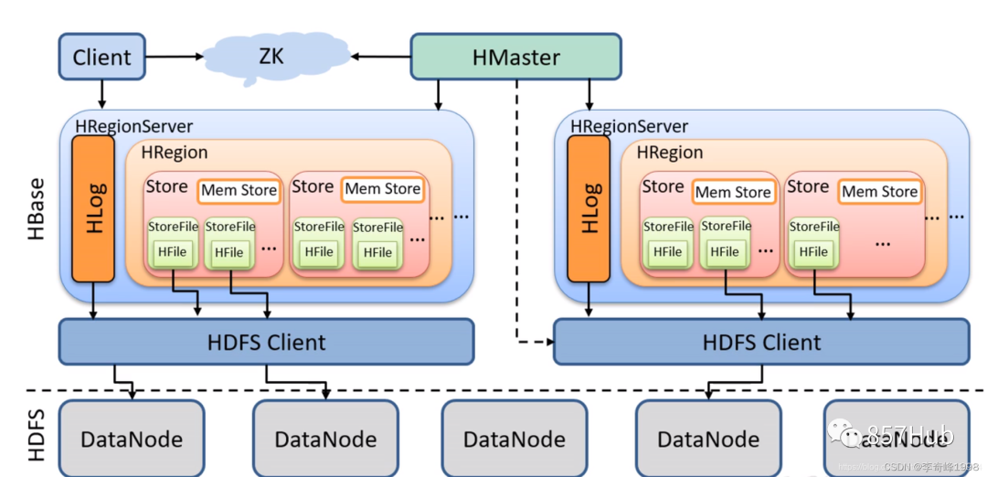 hbase regionserver向zookeeper注册,提供hbase regionserver状态信息(是否在线)。 存放Master管理的表的META元数据信息;表名、列名、key区间等。 Client访问用户数据之前需要首先访问zookeeper中的META.表,根据META表找到用户数据的位置去访问,中间需要多次网络操作,不过client端会做cache缓存。 Master没有单点问题,HBase中可以启动多个Master,通过Zookeeper的事件处理确保整个集群只有一个正在运行的Master。 当RegionServer意外终止后,Master会通过Zookeeper感知到。