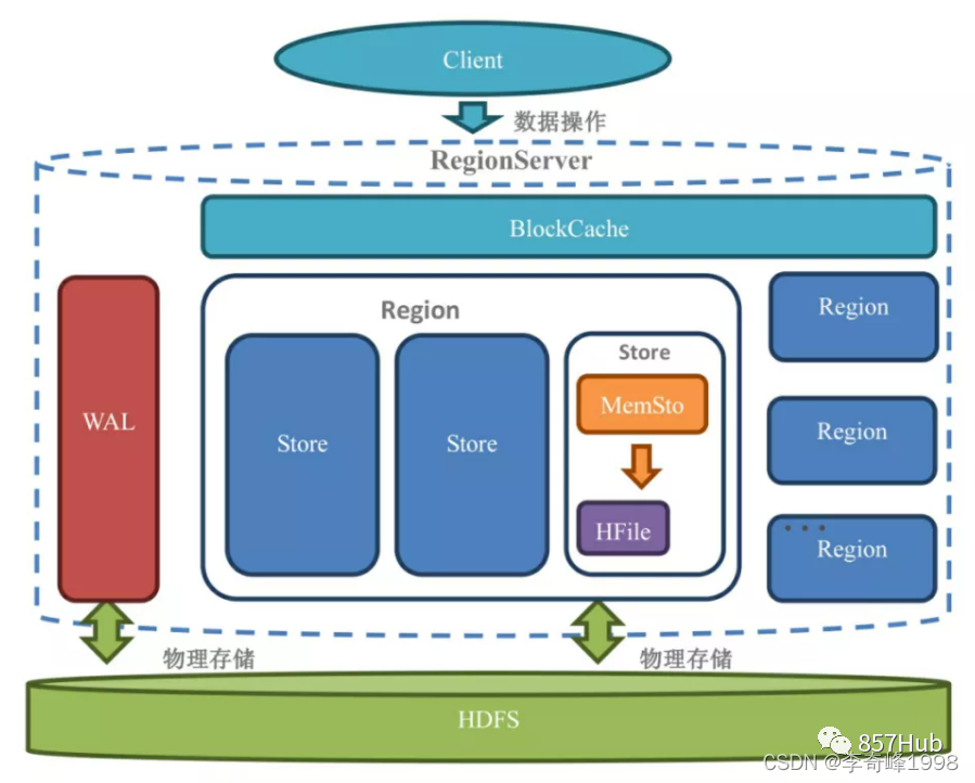 Region: 实际存储数据,HBase表会根据RowKey值被切分成不同的region存储在RegionServer中,在一个RegionServer中可以有多个不同的region