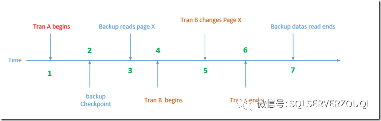 对于页面 X,在时间点3做了备份后,在时间点5被事务B做了修改,因此,此时备份文件中页面X的数据已经过期了、不准确,而备份进程不会回过头来重新读取页面X。因为“完整备份文件必须呈现数据库在备份完成时间点的所有数据”,所以,数据库必须备份事务B的日志,以便在数据库通过重做此日志还原到时间点7的状态。