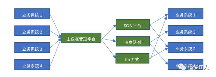 但实际上主数据管理不是一蹴而就的,而且主数据的传播跟业务也很大的相关性,实时性要求高的采用SOA总线接口方式,稍微差一些的采用消息队列方式,批量数据的传播则采用sftp/ftp方式,为了确保数据的一致性和版本管理,中间还构建了主数据管理平台,逐渐的主数据管理就演变成了以下的架构方式。