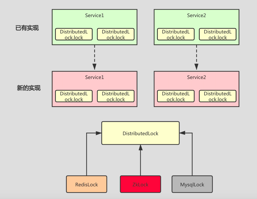 如下图:每个 Service 中都是用的 DistributedLock 接口来加锁,当我们需要替换锁的实现时,使用的地方不需要改动,只需要替换 DistributedLock 的实现即可。