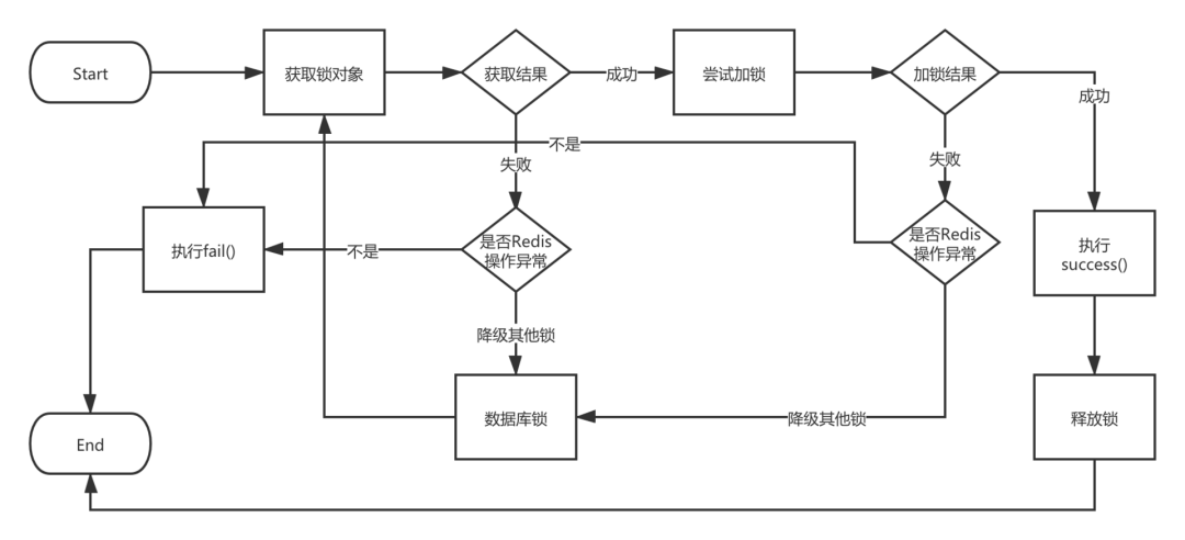 如果数据库锁也不可用了(题外话:所有都不可用可能性非常小),那还是让业务操作失败比较好。因为我们用加锁的场景,肯定是为了防止并发场景带来的问题,如果当锁不可用时,你将异常消费了,让业务操作继续下去,就有可能出现没有加锁的业务问题。