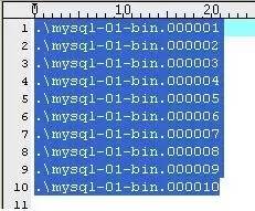服务器一旦开启二进制日志,会产生一个与二日志文件同名,但是以.index结尾的文件。它用于跟踪磁盘上存在哪些二进制日志文件。MySQL用它来定位二进制日志文件。它的内容如下(我的机器上):
