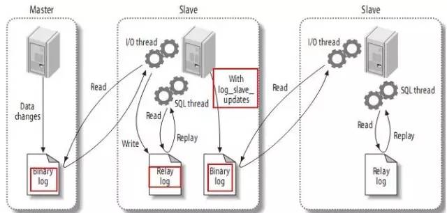 当设置log_slave_updates时,你可以让slave扮演其它slave的master。此时,slave把SQL线程执行的事件写进行自己的二进制日志(binary log),然后,它的slave可以获取这些事件并执行它。如下: