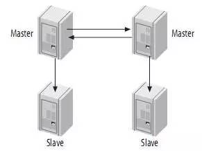 这是master-master结构变化而来的,它避免了M-M的缺点,实际上,这是一种具有容错和高可用性的系统。它的不同点在于其中一个服务只能进行只读操作。如图: