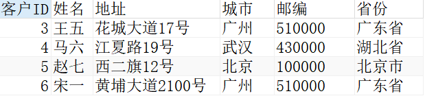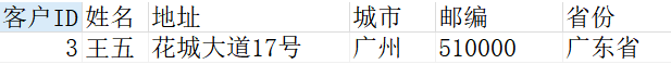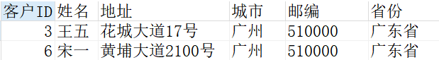 SELECT * FROM customersWHERE `城市`='广州'AND `姓名`='王五'AND `省份`='浙江省'