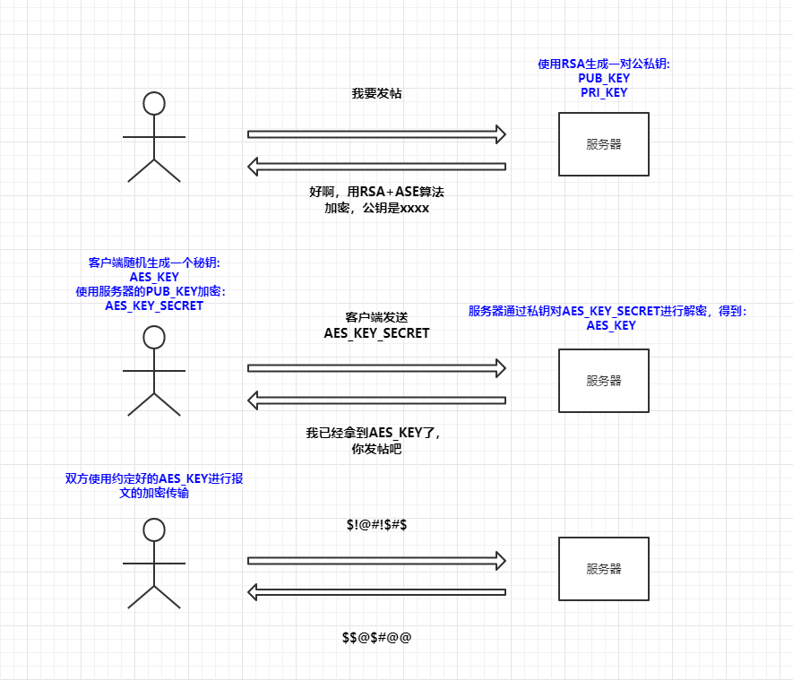 在约定加密方式的时候由服务器生成一对公私钥,服务器将公钥返回给客户端,客户端本地生成一串秘钥(AES_KEY)用于对称加密,并通过服务器发送的公钥进行加密得到(AES_KEY_SECRET),之后返回给服务端。