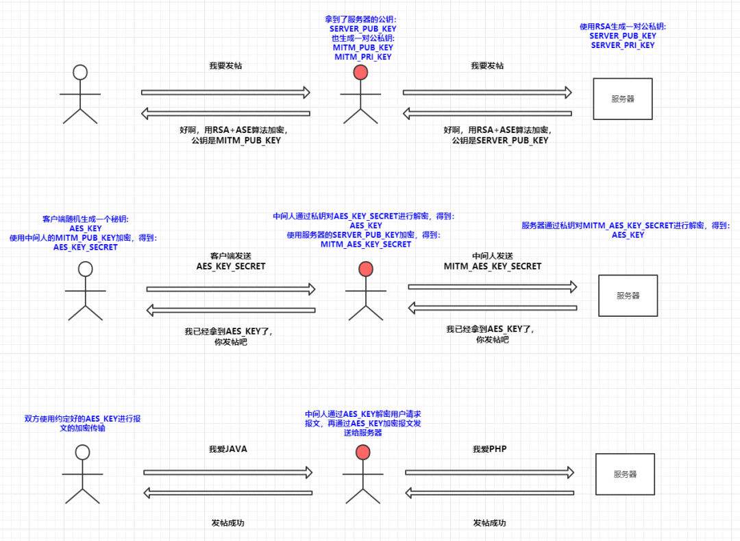 所谓道高一尺魔高一丈,中间人为了对应这种加密方法又想出了一个新的破解方案,既然拿不到 AES_KEY,那我就把自己模拟成一个客户端和服务器端的结合体。