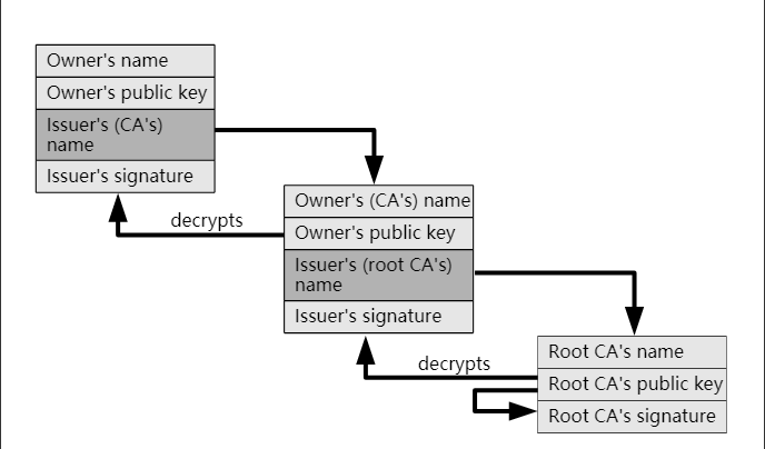 当客户端(浏览器)做证书校验时,会一级一级的向上做检查,直到最后的根证书,如果没有问题说明服务器证书是可以被信任的。