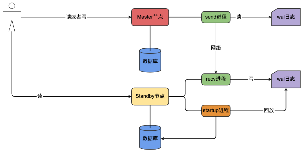 基于wal的物理Replication:postgresql支持物理复制,其原理的就是先把Master节点的热备,然后传输到standby节点,在standby节点恢复;最后master不断的发送数据变更wal日志给standby节点,standby节点不断的接受wal日志,然后进行apply。物理复制是针对所有的Master节点上的databaase.由于wal是基于page的级别的,standby节点应用比较快,开销小。在物理复制中,Master节点会运行多个wal send进程;Standby节点会运行多个wal recv进程和startup进程,send是master发送wal日志的进程;recv进程是standby节点接受wal日志的进程,startup进程是standby节点apply wal日志的进程。