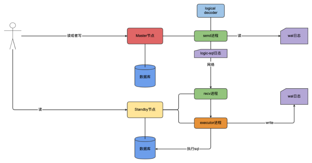 基于SQL的逻辑Replication:基本原理是应用端发出更改请求,master不断的产生日志,紧接着master的send进程读取wal日志,然后经过decode模块进行解析wal日志转换为类似于sql的方式发送给standby的recv进程,recv进程接受到sql日志,发送给standby的execute模块进行解码成为sql语句,然后执行sql语句,产生wal日志。