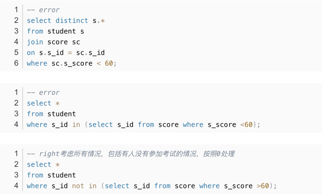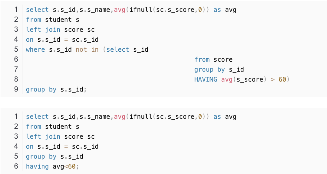 2.2、查询平均成绩小于60分的学生的学号和平均成绩,考虑没参加考试的情况