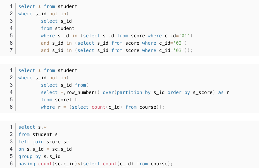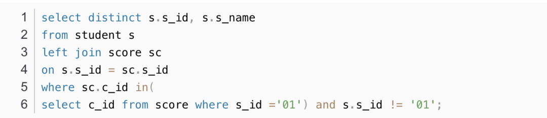 12、查询和“01”号同学所学课程完全相同的其他同学的学号(重点)