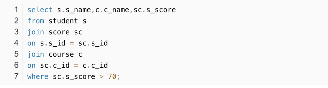 36、查询任何一门课程成绩在70分以上的姓名、课程名称和分数(重点) 注:不用group by