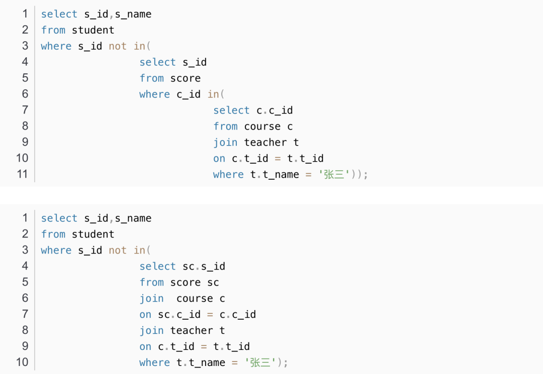 13、查询没学过"张三"老师讲授的任一门课程的学生姓名 和47题一样(重点,能做出来)