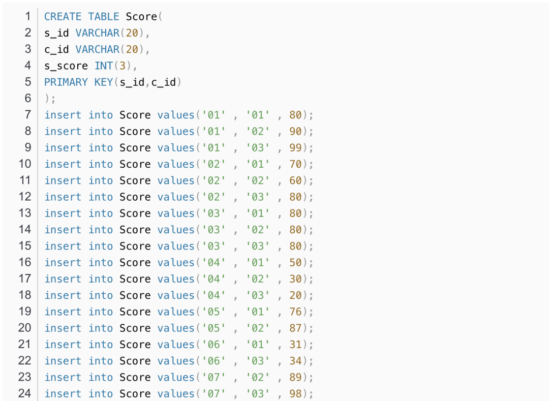25、查询各科成绩前三名的记录(不考虑成绩并列情况)(重点 与22题类似)