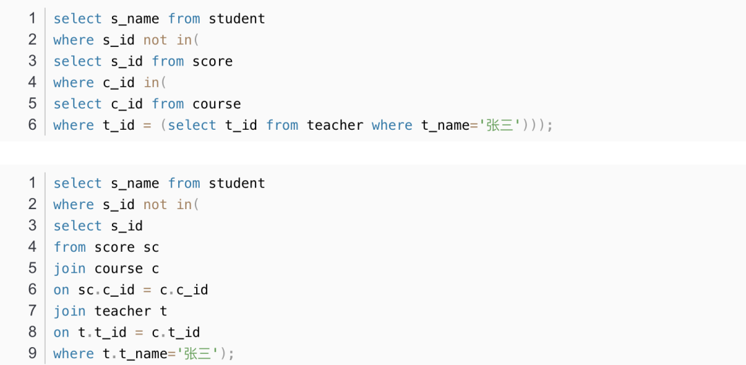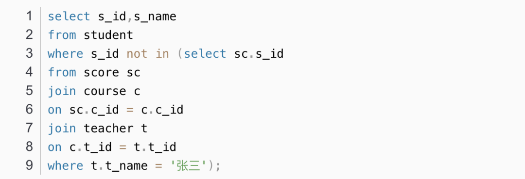 5、查询没学过“张三”老师课的学生的学号、姓名(重点)