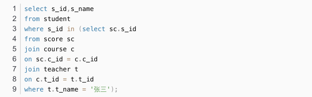 6、查询学过“张三”老师所教的所有课的同学的学号、姓名(重点)