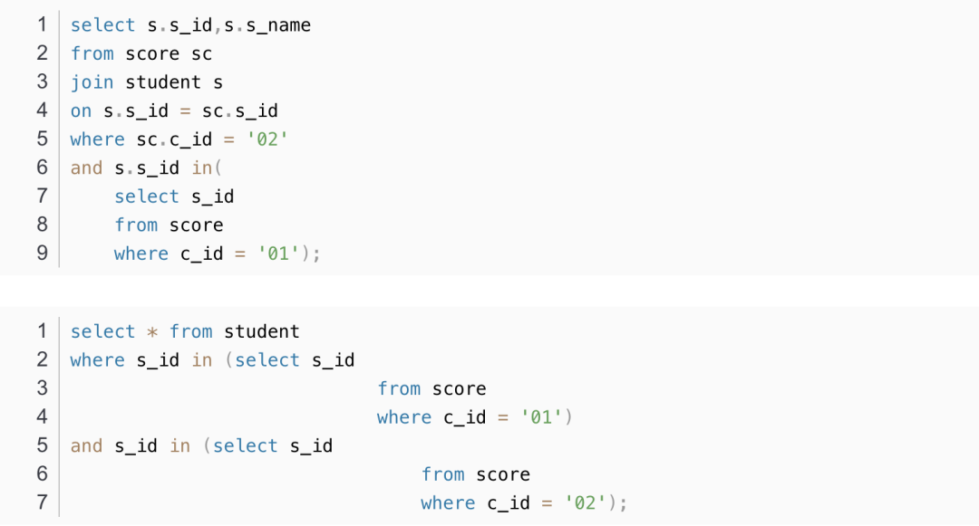 7、查询学过编号为“01”的课程并且也学过编号为“02”的课程的学生的学号、姓名(重点)