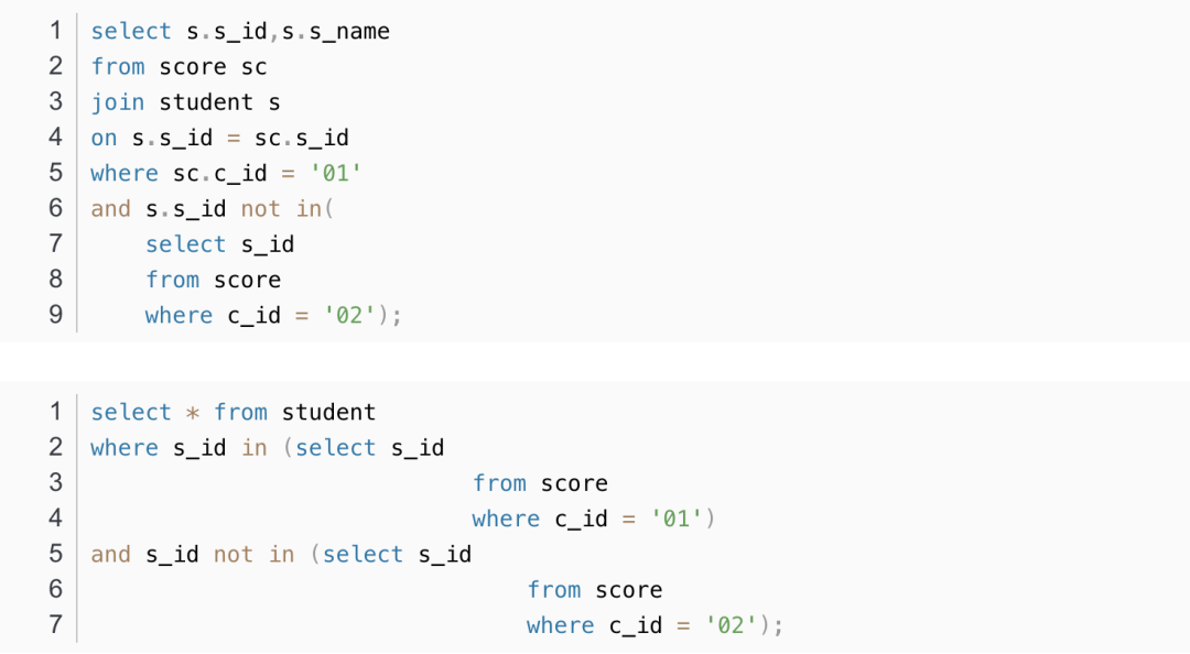 7.1、查询学过编号为“01”的课程但没有学过编号为“02”的课程的学生的学号、姓名(重点)
