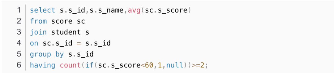 15、查询两门及其以上不及格课程的同学的学号,姓名及其平均成绩(重点)