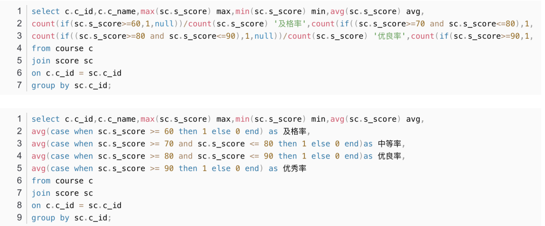 18、查询各科成绩最高分、最低分和平均分:以如下形式显示:课程ID,课程name,最高分,最低分,平均分,及格率,中等率,优良率,优秀率(及格为>=60,中等为:70-80,优良为:80-90,优秀为:>=90) (超级重点)