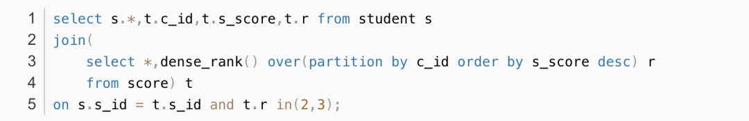 22、查询所有课程的成绩第2名到第3名的学生信息及该课程成绩(重要 25类似)