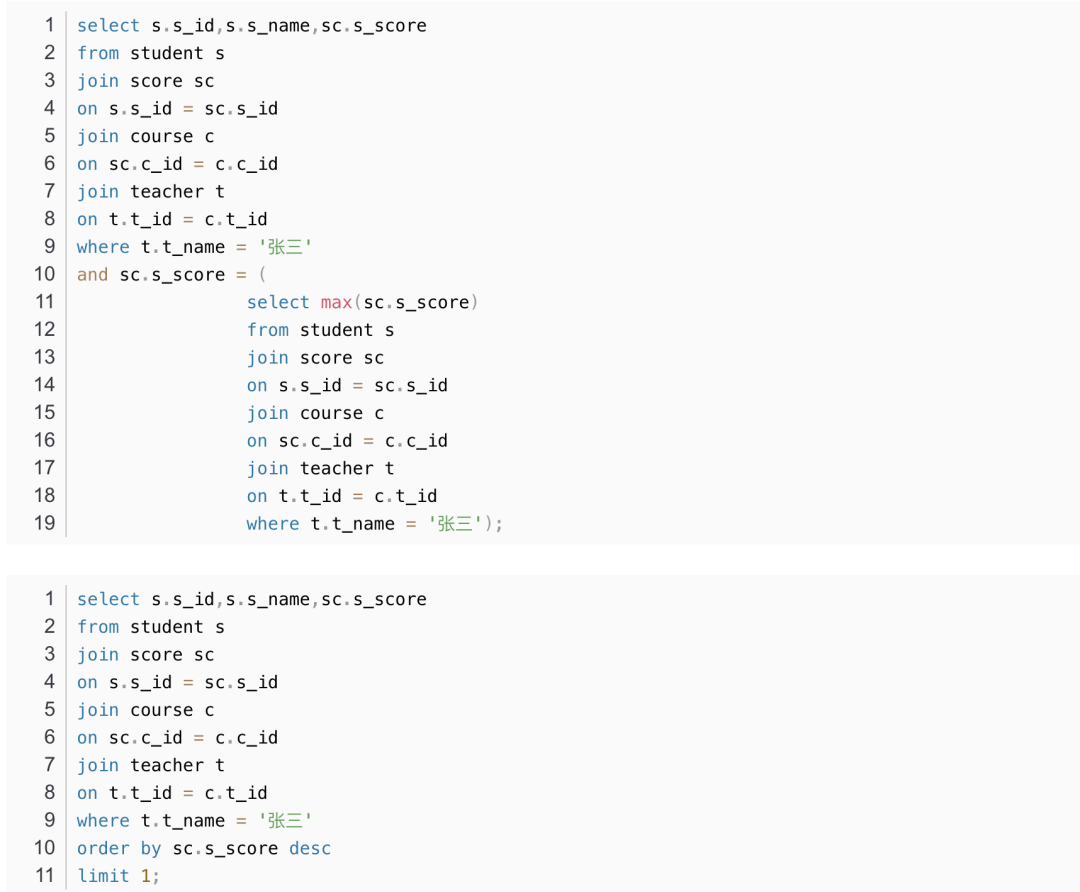 40、查询选修“张三”老师所授课程的学生中成绩最高的学生姓名及其成绩(重要top)(成绩最高学生可能有n个,应该用嵌套查到最高成绩再查成绩等于最高成绩的学生信息)