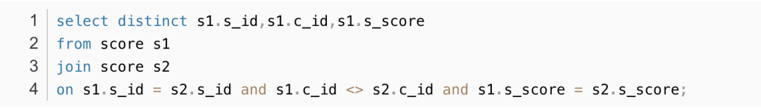 41.查询不同课程成绩相同的学生的学生编号、课程编号、学生成绩 (重点)