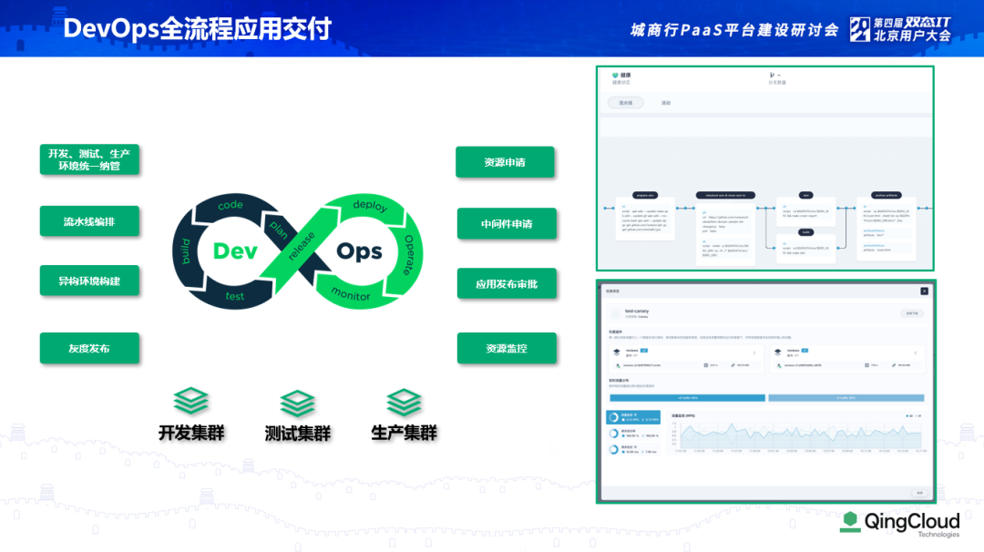 DevOps 将开发、测试、运维打通,解决传统的割裂式问题。青云也在方案里整合了 DevOps 流水线的交付组件,让开发者、测试人员以及最终上线的运维串联起来。青云同样可以支持灰度发布,开发者代码提交、构建,测试后发布到预生产环境,以准入准出审批节点保障审批通过后才能上线灰度发布,根据我们流量访问请求的比例进行灰度控制,这些都是在解决方案里具备的能力。