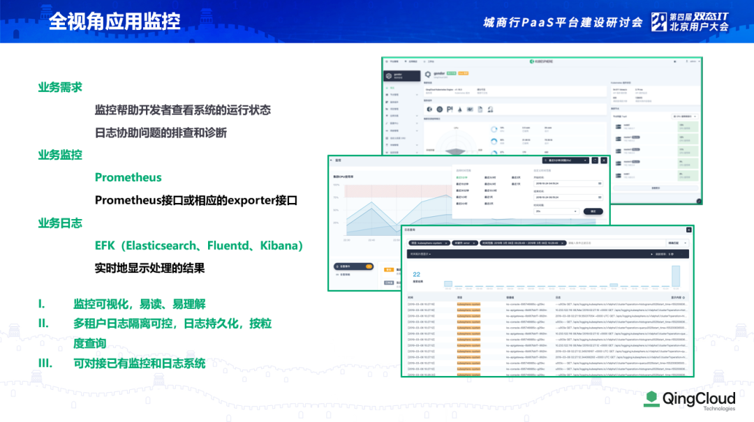 日志也非常重要。刚才北京银行的专家分享到他们用到 EFK,青云平台也深度集成了 EFK 组件来做日志的实时处理。用户可以通过项目、业务和租户等不同视角查看,也可以通过网络字段查询。因为很多银行都有自己的日志中心,用户也可以把日志放在日志中心里。