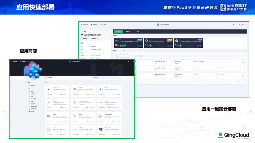 这是青云应用商店的界面。用户可以根据需求自己做应用分类。青云平台提供了一些应用,同时支持售后服务、技术支持等。这些 PaaS 组件是用容器的方式来做的,支持应用的快速部署,支持多集群管理,并且支持一键快速分发。