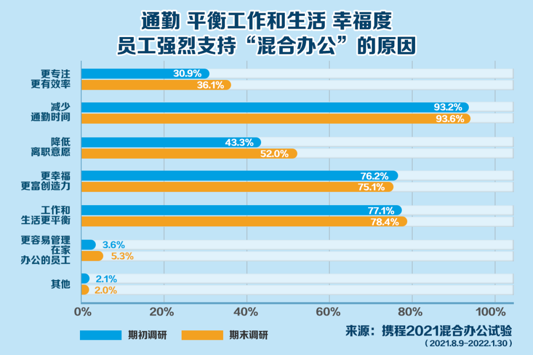 在上述近六成支持混合办公的员工调研中,投票最高的3个理由:减少了通勤时间,时间利用更高效(93.6%);便于平衡工作和生活(78.4%);幸福度高,工作上更有创造力(75.1%)。