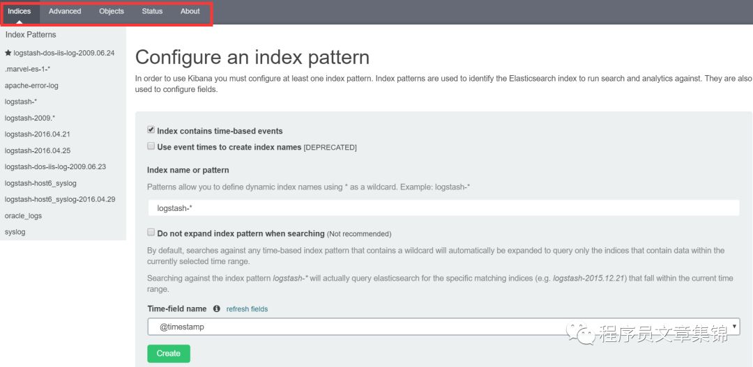 第一步:在logstash成功将apache错误日志导入elasticsearch后,我们在setting中创建索引模式,index name or pattern 与elasticsearch中索引名字需填写一致,点击create。