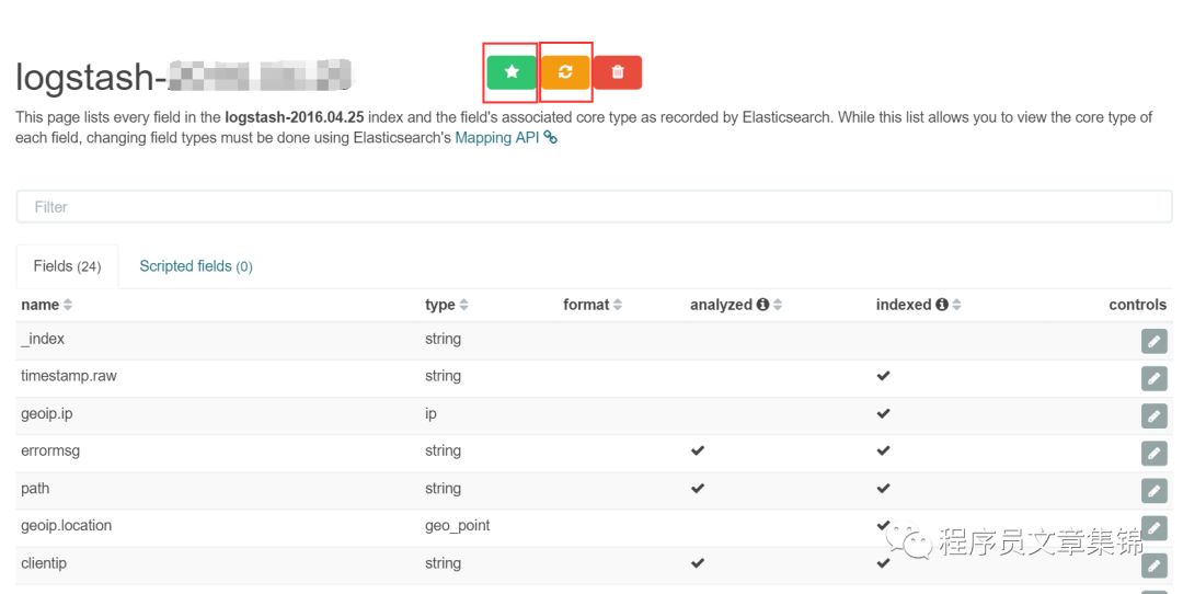 页面会弹出一个新的界面,显示索引数据的字段。点击星号,可将其设为默认的索引;点击刷新符号,将索引数据的字段刷新重新载入kibana。需注意:一般创建好索引之后都需刷新一下字段,防止在discover页面不能识别字段名。