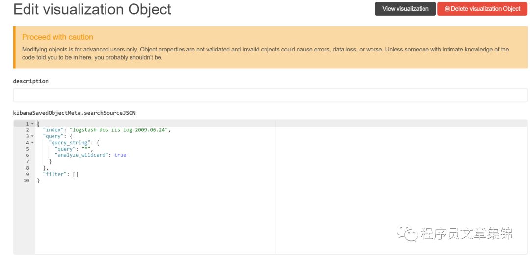 当编辑一个已保存的对象时,进入 Objects,选择编辑已保存的对象,点击 Edit 按钮,修改对象定义。在这个标签中还能修改对象的名字,添加一段说明,以及修改定义这个对象的属性的 JSON。如果要访问一个对象,而它关联的索引已经被删除了,Kibana 会显示这个对象的编辑(Edit Object)页。可以操作: