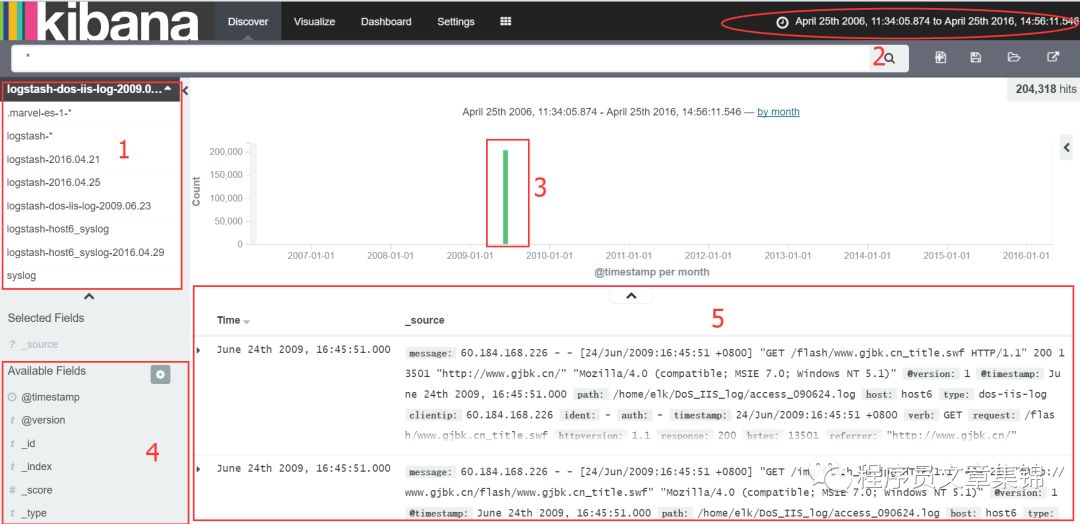第1部分为选择已创建好的索引名,所有在setting中创建的索引模式在该部分都能查询,选择目标索引名。