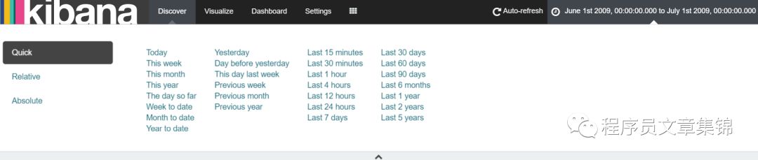 设置页面自动刷新的间隔以查看最新索引进来的数据。这个设置会定期提交搜索请求。设置刷新间隔后,它会出现在菜单栏的时间过滤器左侧。