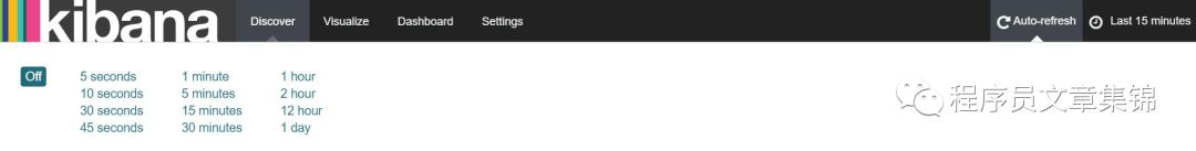 同时会发现在此处有个标签。它可以配置一个刷新间隔来自动刷新 Discover 页面的最新索引数据。若要想自动刷新数据,点击Auto-refresh按钮然后选择一个自动刷新间隔,自动刷新会在后面章节做详细介绍