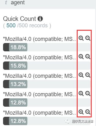 1点击要过滤的字段名。会显示这个字段的前 5 名数据。每个数据的右侧,有两个小按钮一个用来添加常规(正向)过滤器,一个用来添加反向过滤器。