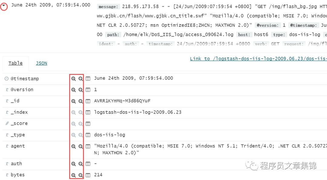 1点击表格第一列(通常都是时间)文档内容左侧的 Expand 按钮 , 展开文档表格中的文档。每个字段名的右侧,有两个小按钮,一个用来添加常规(正向)过滤器,一个用来添加反向过滤器。